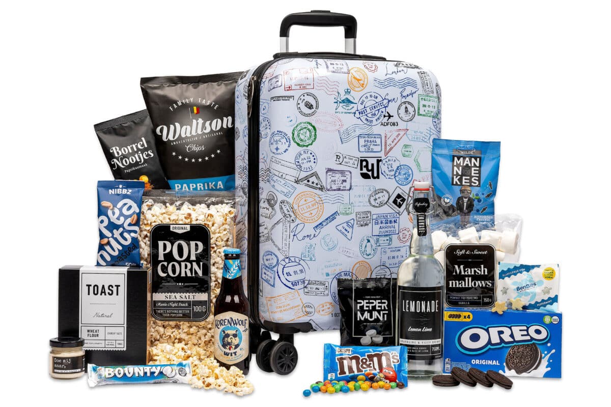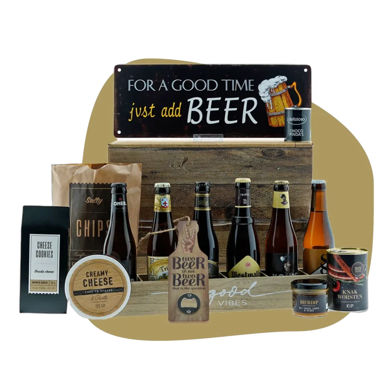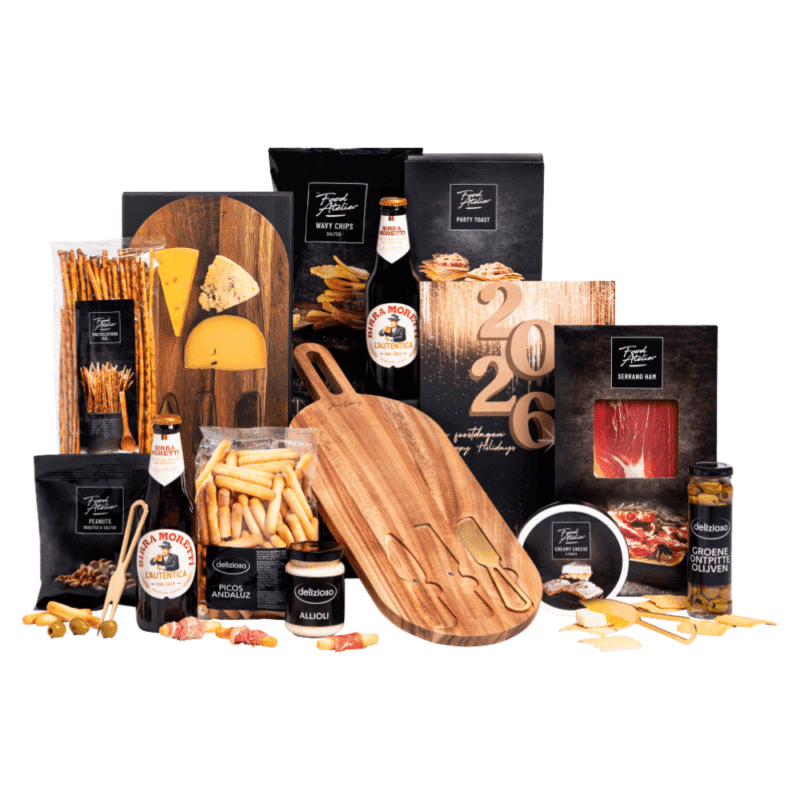 - Een blikvanger: het hero-item dat het pakket bijzonder maakt, zoals een borrelplank, fondueset of BBQ-accessoire